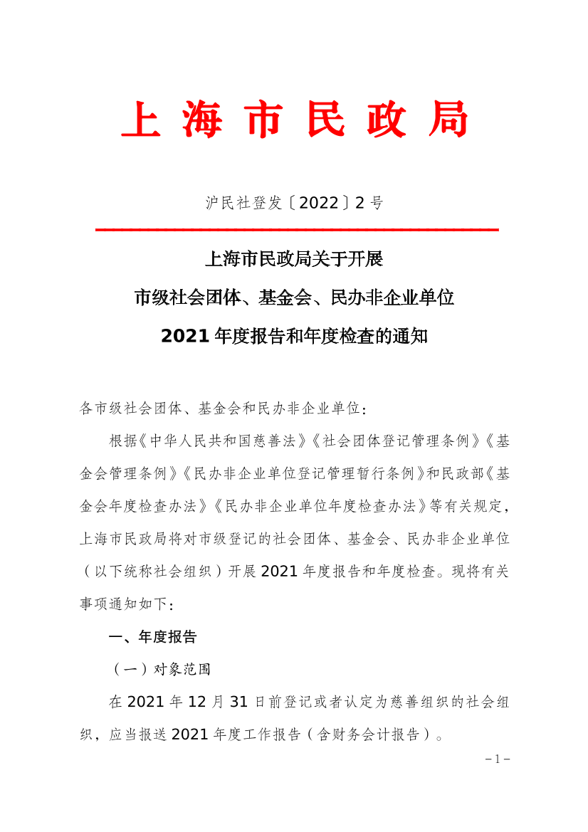 上海市民政局关于开展市级社会团体、基金会、民办非企业单位2021年度报告和年度检查的通知 ( 2022-03-04 )