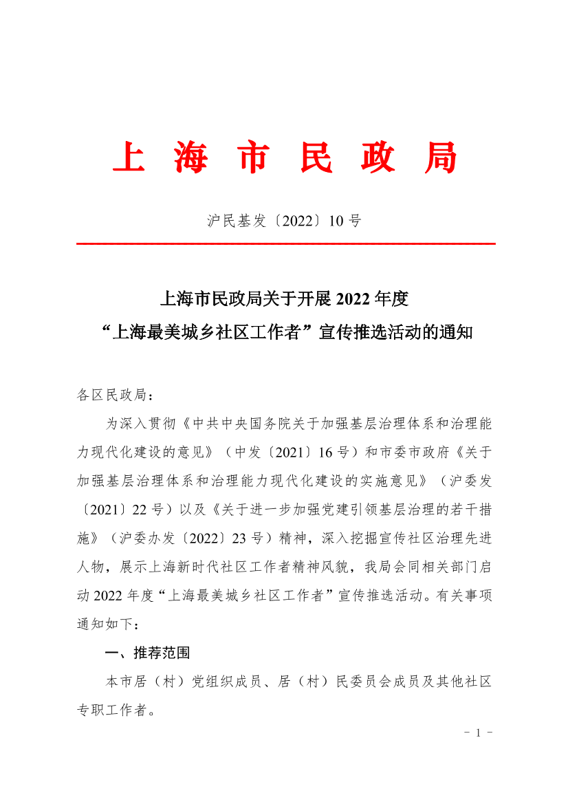 上海市民政局关于开展2022年度“上海最美城乡社区工作者”宣传推选活动的通知 ( 2022-12-23 )