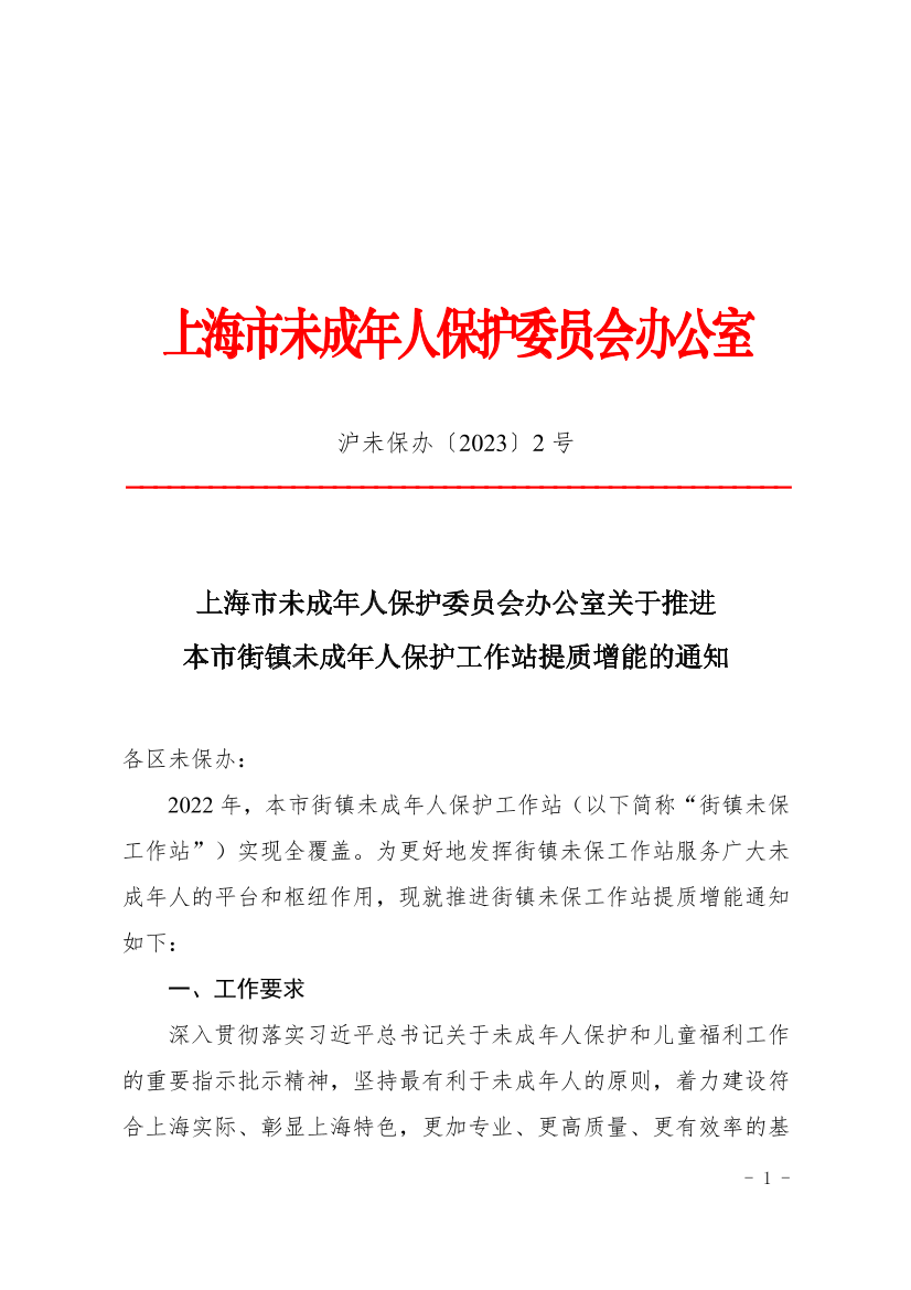 上海市未成年人保护委员会办公室关于推进本市街镇未成年人保护工作站提质增能的通知 ( 2023-04-21 )