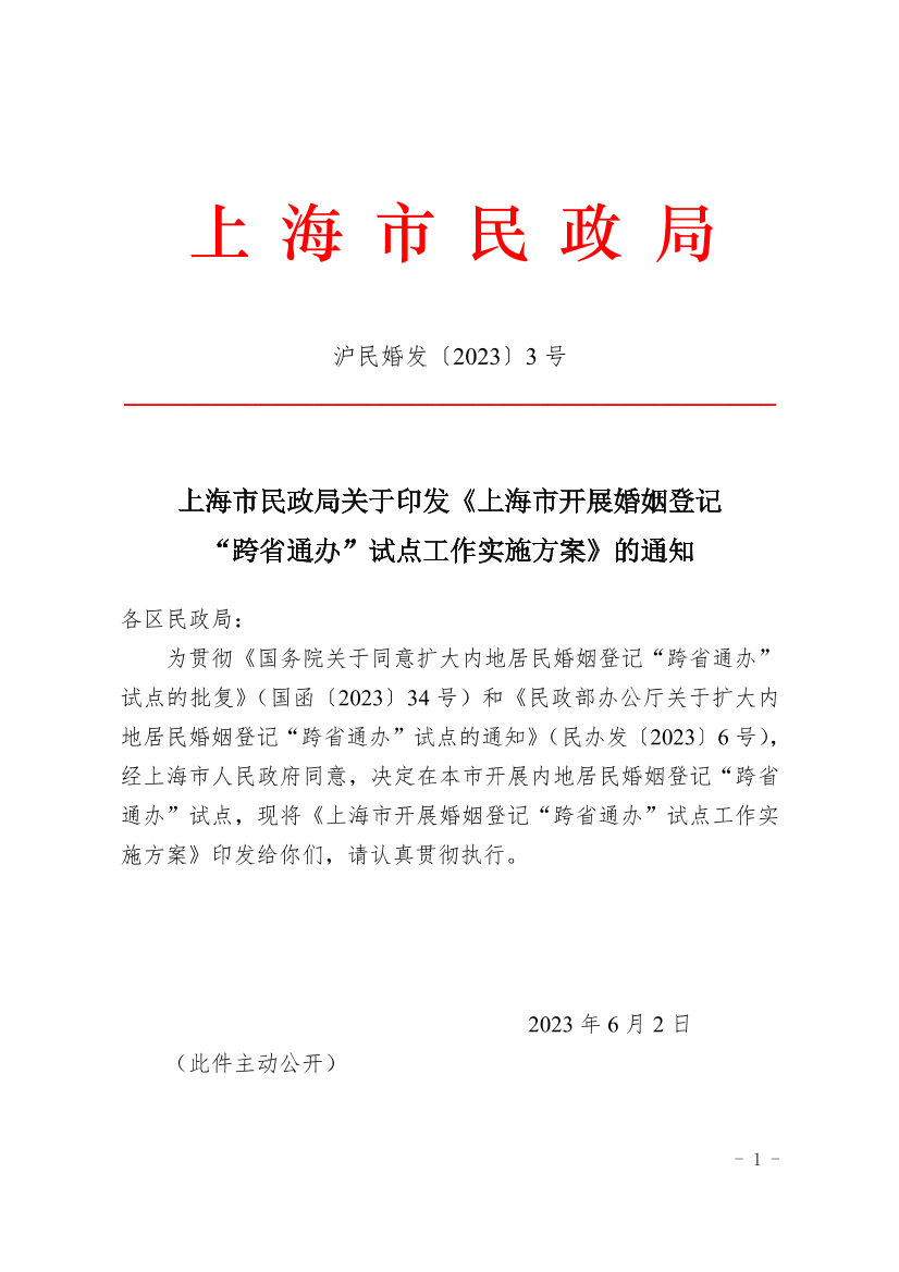 为贯彻《国务院关于同意扩大内地居民婚姻登记“跨省通办”试点的批复》(国函〔2023〕34号)和《民政部办公厅关于扩大内地居民婚姻登记“跨省通办”试点的通知》(民办发〔2023〕6号),经上海市人民政府同意,决定在本市开展内地居民婚姻登记“跨省通办”试点,现将《上海市开展婚姻登记“跨省通办”试点工作实施方案》印发给你们,请认真贯彻执行。