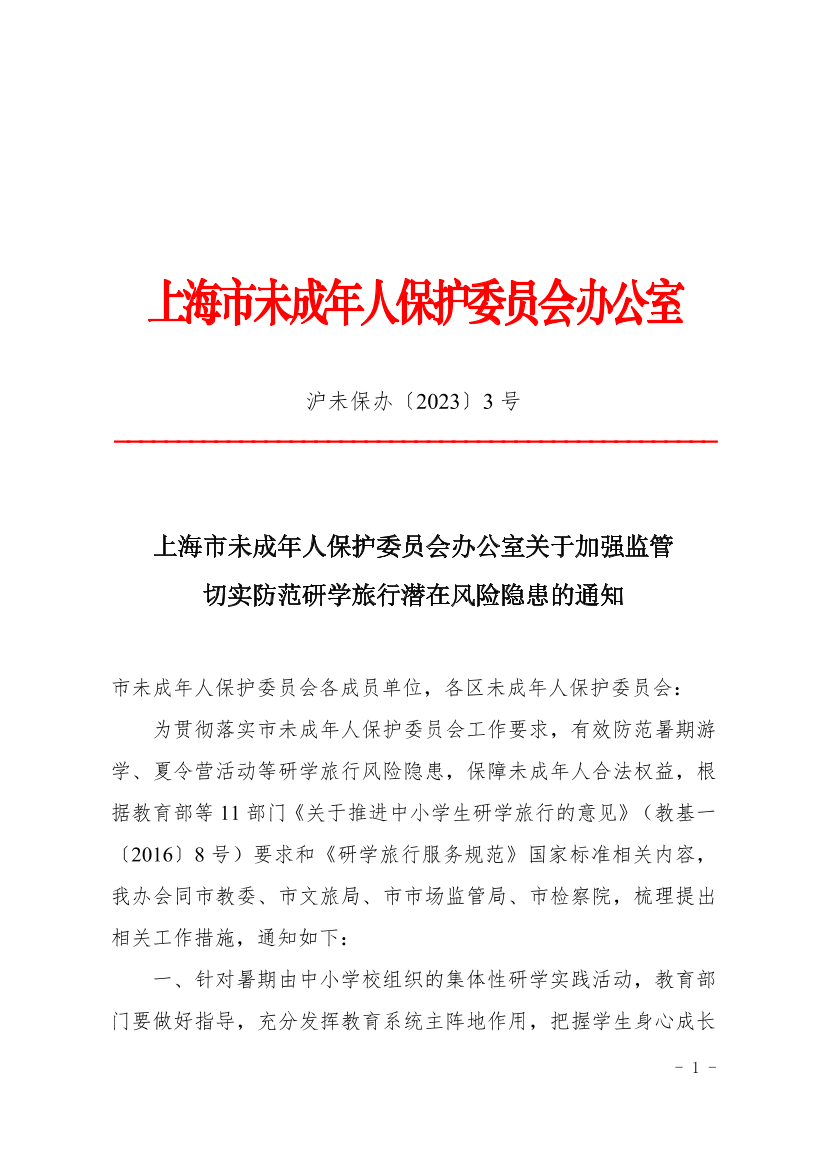 上海市未成年人保护委员会办公室关于加强监管切实防范研学旅行潜在风险隐患的通知 ( 2023-06-26 )