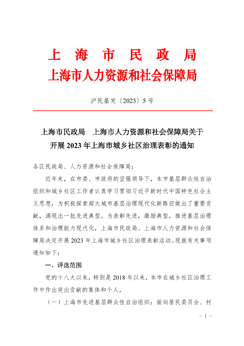 上海市民政局 上海市人力资源和社会保障局关于开展2023年上海市城乡社区治理表彰的通知 ( 2023-07-21 )