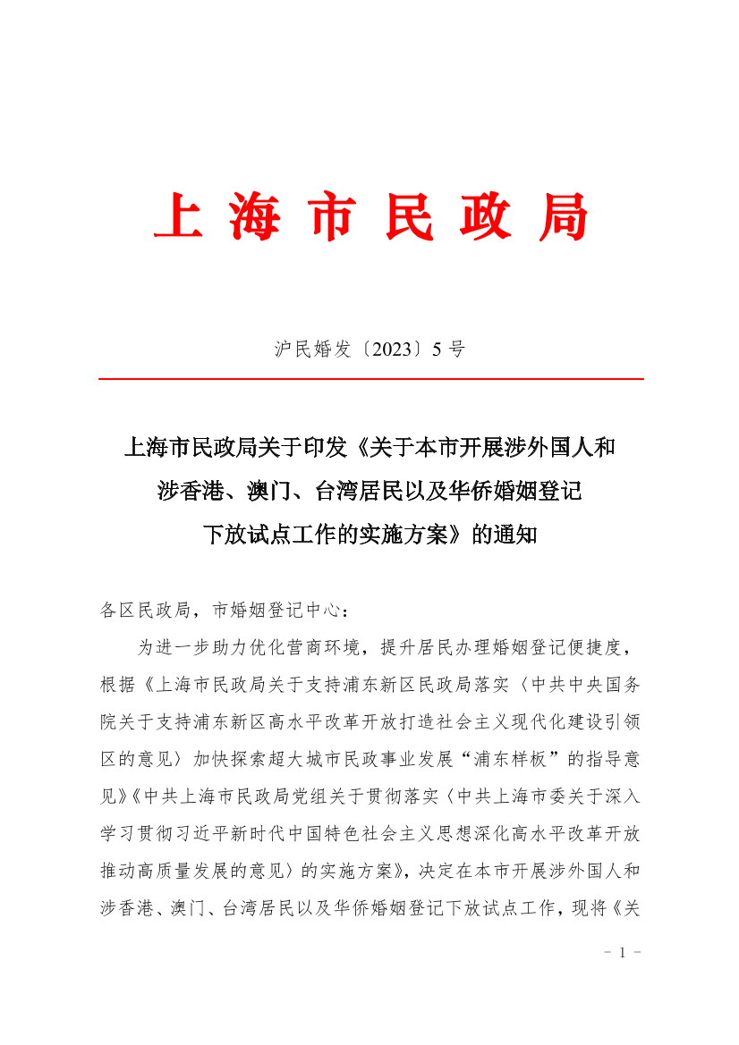 为进一步助力优化营商环境,提升居民办理婚姻登记便捷度,根据《上海市民政局关于支持浦东新区民政局落实〈中共中央国务院关于支持浦东新区高水平改革开放打造社会主义现代化建设引领区的意见〉加快探索超大城市民政事业发展“浦东样板”的指导意见》《中共上海市民政局党组关于贯彻落实〈中共上海市委关于深入学习贯彻习近平新时代中国特色社会主义思想深化高水平改革开放推动高质量发展的意见〉的实施方案》,决定在本市开展涉外国人和涉香港、澳门、台湾居民以及华侨婚姻登记下放试点工作,现将《关于本市开展涉外国人和涉香港、澳门、台湾居民以及华侨婚姻登记下放试点工作的实施方案》印发给你们,请认真贯彻执行。