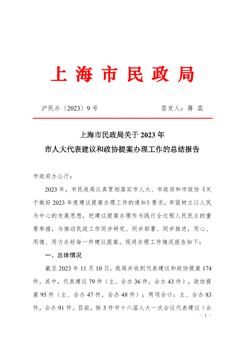 上海市民政局关于2023年市人大代表建议和政协提案办理工作的总结报告 ( 2023-11-17 )