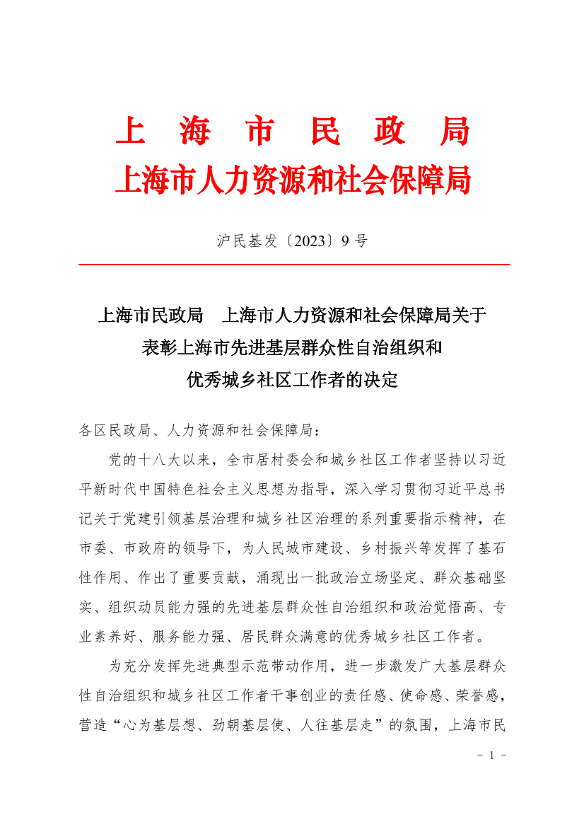 上海市民政局 上海市人力资源和社会保障局关于表彰上海市先进基层群众性自治组织和优秀城乡社区工作者的决定 ( 2023-11-21 )