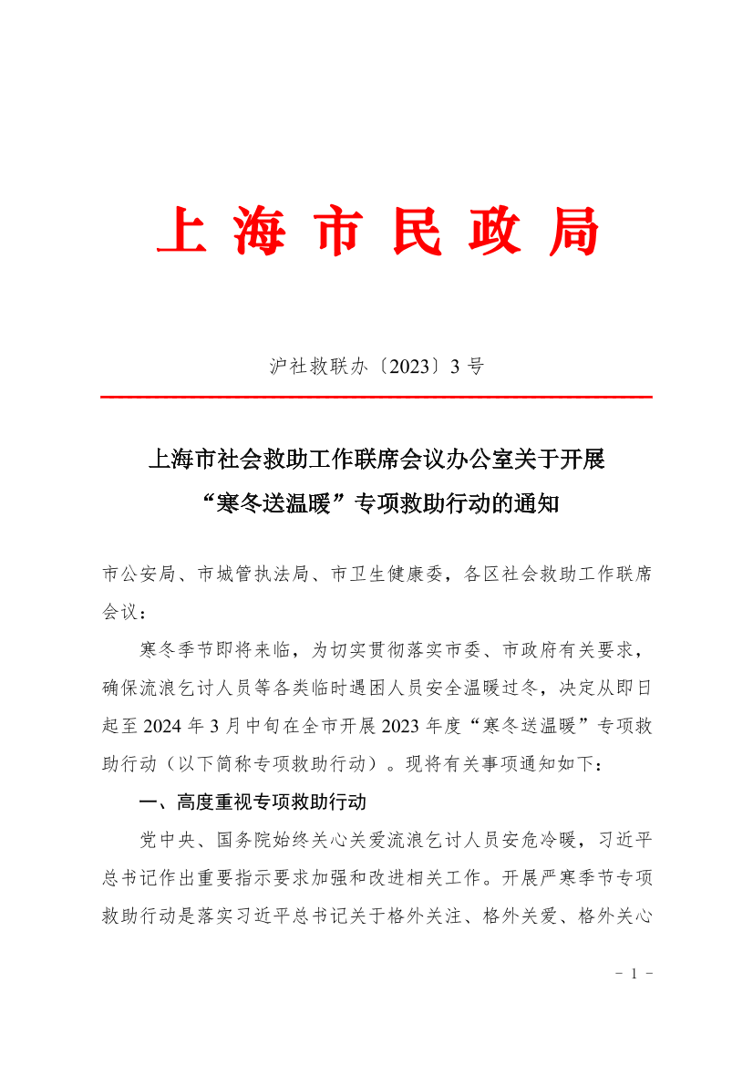 上海市社会救助工作联席会议办公室关于开展“寒冬送温暖”专项救助行动的通知 ( 2023-12-08 )
