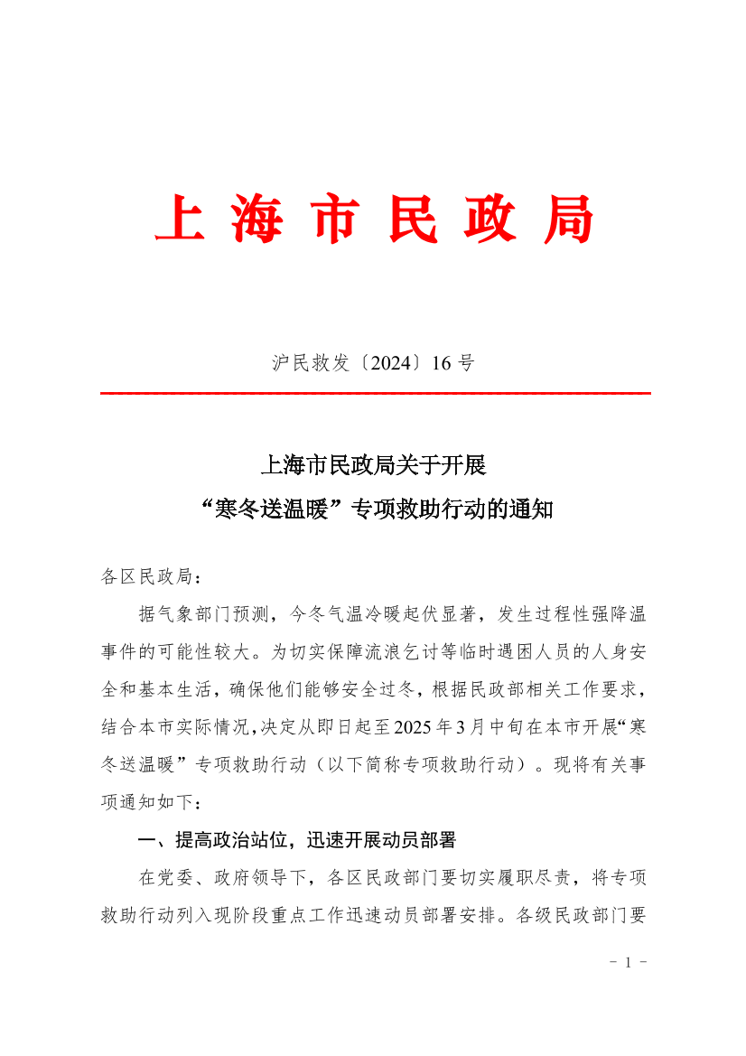 上海市民政局关于开展“寒冬送温暖”专项救助行动的通知 ( 2024-12-13 )