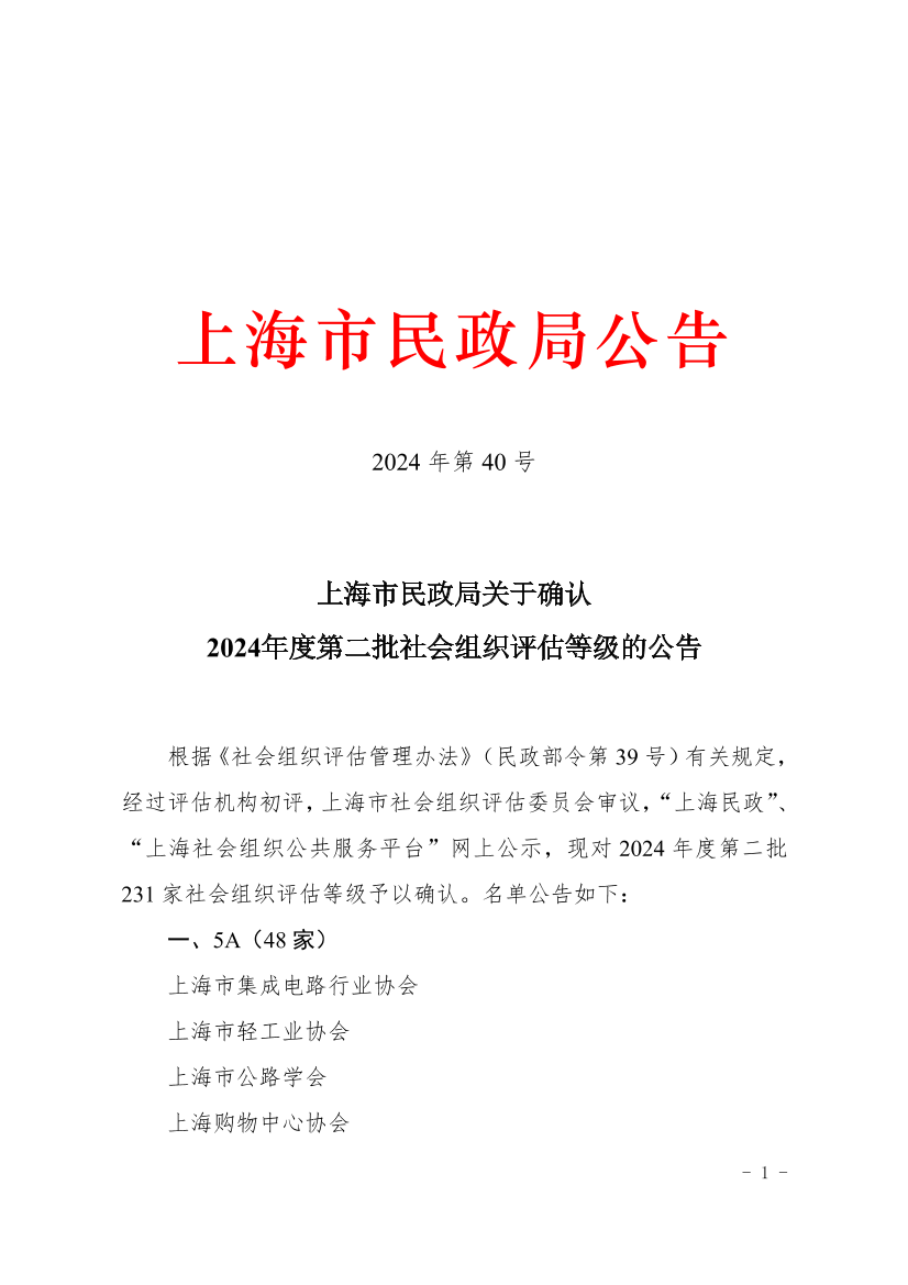 根据《社会组织评估管理办法》(民政部令第39号)有关规定,经过评估机构初评,上海市社会组织评估委员会审议,“上海民政”、“上海社会组织公共服务平台”网上公示,现对2024年度第二批231家社会组织评估等级予以确认。名单公告如下: