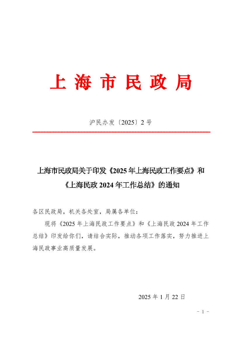 现将《2025年上海民政工作要点》和《上海民政2024年工作总结》印发给你们,请结合实际,推动各项工作落实,努力推进上海民政事业高质量发展。