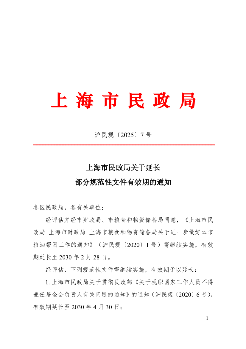 1.上海市民政局关于贯彻民政部《关于现职国家工作人员不得兼任基金会负责人有关问题的通知》的通知(沪民规〔2020〕6号),有效期延长至2030年4月30日;