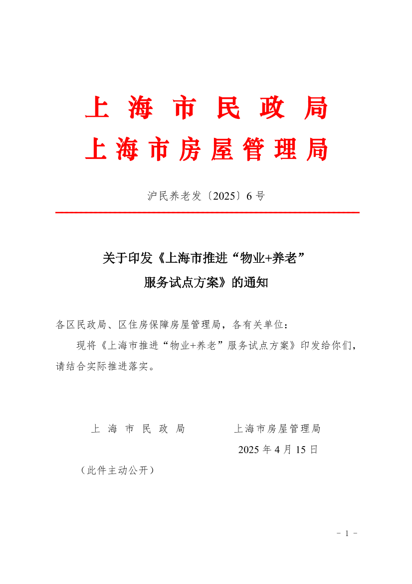 关于印发《上海市推进“物业 养老”服务试点方案》的通知 ( 2025-04-28 )