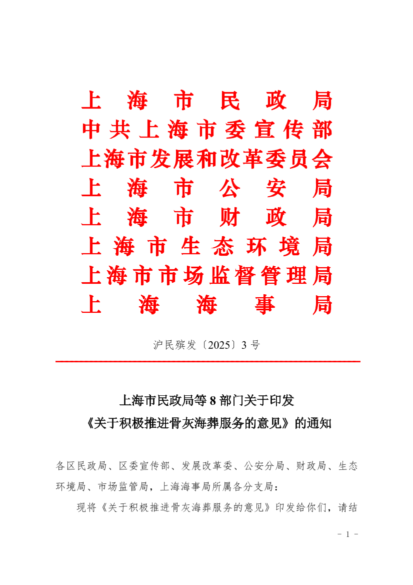 上海市民政局等8部门关于印发《关于积极推进骨灰海葬服务的意见》的通知 ( 2025-07-21 )